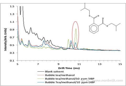 GA2100型電噴霧-高分辨離子遷移譜能夠用于食品中有害污染物的快速定性定量分析,例如12種酞酸酯的快速分析,具有很高的的選擇性和分離度,分析時間僅僅是十幾秒,遠遠優(yōu)于液相色譜。檢測限是法規(guī)要求限量的三十分之一,但是樣品前處理遠遠比標(biāo)準(zhǔn)方法采用的前處理簡單。牛奶中三聚氰胺的檢測濃度可低至ppm。除了三聚氰胺之外,電噴霧-高分辨離子遷移譜還可以用于藥物,染料和激素的分析,分離度大于60。只需幾微升的樣品,檢測濃度可低至幾個納克。GA2100的優(yōu)勢是分析速度快,樣品制備簡單,以及現(xiàn)場定性定量分析。