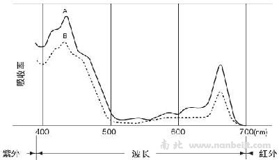 從圖中可以看出,葉綠素在藍(lán)色區(qū)域(400—500nm)和紅色區(qū)域(600—700nm)范圍內(nèi)吸收達(dá)到了峰值,但在近紅外區(qū)域卻沒(méi)有吸收。