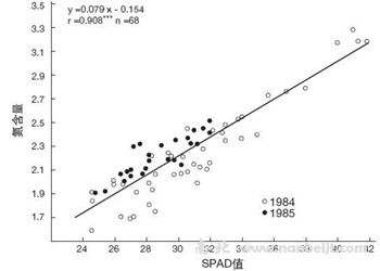 葉子中葉綠素含量與作物目前的營(yíng)養(yǎng)狀況有關(guān)。從下圖中可以看到,葉綠素含量(用SPAD值表示)與葉子中的氮含量(一種重要的營(yíng)養(yǎng)成分)成比例增長(zhǎng)。對(duì)一作物品種來(lái)說(shuō),SAPD指數(shù)越高,代表此作物越健康。