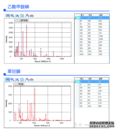 SSR系列檢測儀提供的農(nóng)、獸藥拉曼光譜圖譜庫,由檢驗檢疫科學(xué)研究院,中檢國研(北京)科技有限公司,以及南京簡智儀器設(shè)備有限公司聯(lián)合采集。其標(biāo)準(zhǔn)品主要由Dr.Ehrenstorfer(DR)、sigma公司下的Riedel-de Han(RDH)、日本林純藥株式會社三家公司提供,共計642種農(nóng)藥、獸藥。每一種農(nóng)獸藥除標(biāo)準(zhǔn)拉曼光譜圖外,還包含其基本信息(包括英文通用名、中文通用名、CAS NO.、分子結(jié)構(gòu)式、分子式、標(biāo)準(zhǔn)品購買廠商、貨號、純度、理化性質(zhì)、用途),每一張拉曼譜圖都標(biāo)出特征峰位置。