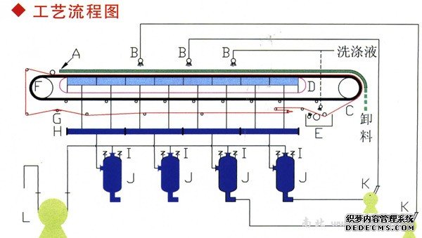 G、糾偏裝置 H、濾液裝置 I、切換閥 J、排液分離器 K、洗滌泵 L、真空泵