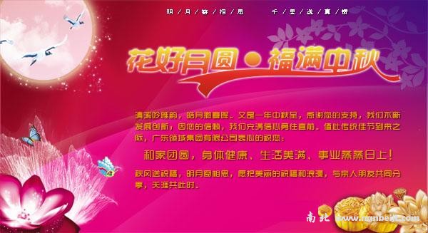 鄭州南北儀器設備有限公司全體員工對社會各界人士致以真誠的節日問候!月光皎皎,月餅甜甜,月桂香香,月兒圓圓,千江月明千江水,萬里花飄萬里情,良辰吉日里遙寄思念,花好月圓中放飛祝福,感謝您長期以來的關心支持和愛護,敬祝您中秋快樂,合家幸福,吉祥如意,大展宏圖!