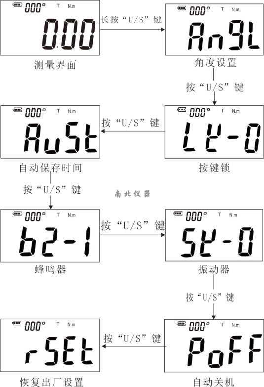 ”(不恢復(fù)出廠設(shè)置)。若選擇恢復(fù)出廠設(shè)置,選擇“yes”后迅速短按“U/S”鍵,液晶屏隨后出現(xiàn)“succ”(已恢復(fù)出廠設(shè)置),并且系統(tǒng)自動返回到測量界面。若選擇不恢復(fù)出廠設(shè)置,選擇“