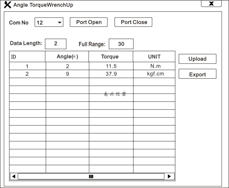 使用制造商提供的光盤,在電腦上安裝好通訊軟件,然后在數(shù)顯扳手開機(jī)狀態(tài)下用數(shù)據(jù)線連接數(shù)顯扳手和電腦,雙擊軟件圖標(biāo),打開軟件,先選擇“Com No(端口號)”,再點(diǎn)擊“Part Open”,然后點(diǎn)擊“Upload”,這時(shí)表格上會出現(xiàn)本儀器內(nèi)的存儲數(shù)據(jù),表示上位機(jī)已連接成功,已達(dá)到讀取存儲數(shù)據(jù)的目的。如下圖所示: