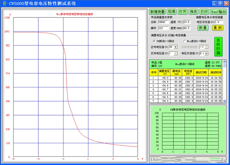 測試程序控制電容電壓特性測試測試儀進行測量并采集測試數據,把采集到的數據在計算機中加以分析,然后把測試數據以表格,圖形直觀地記錄、顯示出來。用戶可對采集到的數據在計算機中保存或者打印以備日后參考和查看,還可以把采集到的數據輸出到Excel中,讓用戶對數據進行各種數據分析。