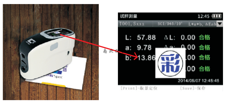 顯示:光譜圖/數(shù)據(jù),樣品色度值,色差值,合格/不合格結(jié)果,顏色偏向,顯示測量區(qū)域,歷史數(shù)據(jù)色彩,手動輸入標(biāo)準(zhǔn)樣,生成檢測報告