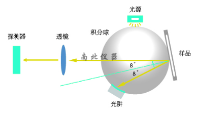 1、 儀器采用通用的D/8(積分球漫射照明,8°觀察角)SCI/SCE兼容照明觀察條件