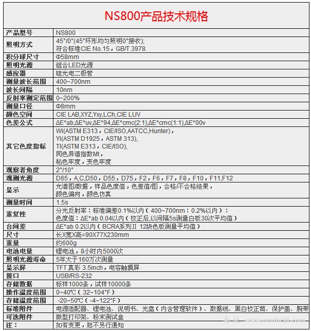 還分析了日本、美國和德國等分光測色儀的參數,他 們之間的Lab相對值都控制在±1.5以內。NS800與日本儀器之間的Lab值比較,測任何顏色的物品,都能將Lab的大差距控制在±1.0以內,這 是3nh高新科技的突破,實現了與市場的完全兼容,一場高精度國產化分光測色儀的革命即將來臨!
